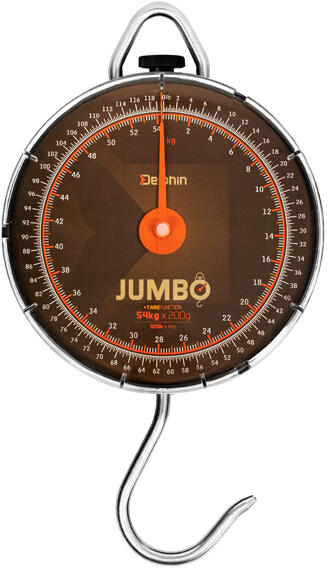 Robusztus mechanikus mérleg a nagyobb halak mérlegelésére. A Delphin JUMBO mérleg erős szerkezete lehetővé teszi 54kg-ig a mérést, minimális eltéréssel. A mért súly a nagy előlapon mutatkozik, két mértékegységben, kilogrammban és fontban. Mérésnél az emelést az erős fém tartó segíti. Ezeknek a tulajdonságainak köszönhetően a Delphin JUMBO mérleg a horgászaton kívül megtalálja máshol is a kihasználását mint a vadászatnál vagy a mindennapokban. Műszaki paraméterek: